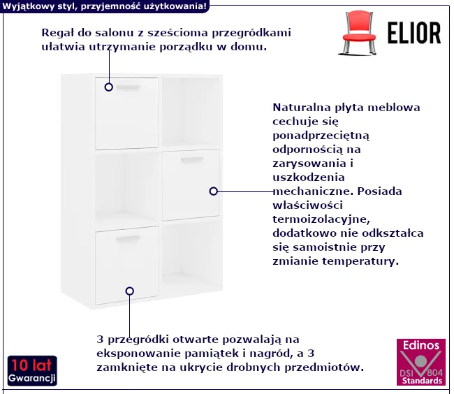 • Kolor: biały. W naszej ofercie posiadamy także inne regały do salonu.