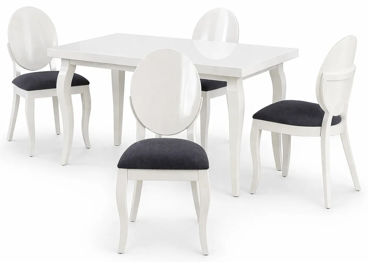 Zestaw Aproxi zawiera stół oraz 4 krzesła. Jeśli potrzebujesz większej ilości krzeseł sprawdź krzesło Lavon i dobierz odpowiednią dla Ciebie ilość. Rozkładany stół z krzesłami Aproxi po prostu Cię urządzi! Nada on Twojemu wnętrzu blasku i wniesie do niego promienną, wyszukaną atmosferę. Efektowny salon czy jadalnia– możesz je mieć na wyciągnięcie ręki. Wystarczy, że zainwestujesz w jedyny w swoim rodzaju, komfortowy zestaw Aproxi.