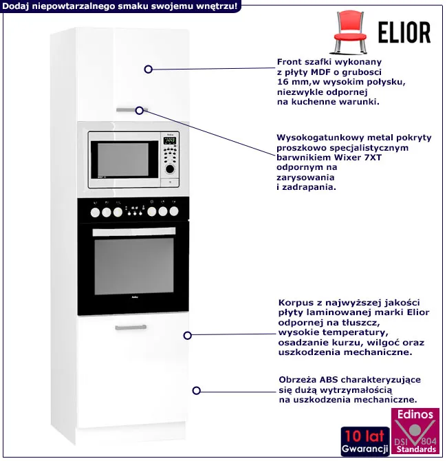 Kolekcje mebli kuchennych Elora marki Elior stworzyliśmy z dbałością o każdy szczegół, tak by wybrane przez Ciebie meble służyły Ci niezmiennie przez długie lata. Dzięki nim dodasz smaku Twojemu wnętrzu i urządzisz kuchnię swoich marzeń. Wybieraj spośród aż 27 modułów lub 2 uniwersalnych kompletów o długości 180/240 cm oraz 260 cm. Kuchnia ma służyć Ci długo, dlatego oczekujesz od niej funkcjonalności oraz trwałości. Z tego powodu każdy z białych korpusów szafek kolekcji Elora wyprodukowany został z najwyższej jakości płyty laminowanej o klasie higieny E1, niezwykle odpornej na warunki panujące w kuchni podczas gotowania. Fronty wykonano natomiast z płyty MDF o wysokim połysku, przepięknie komponującej się razem z mocnymi uchwytami stworzonymi z wysokogatunkowego metalu o wykończeniu podobnym do chromowanej stali. Do wyprodukowania kolekcji Elora wykorzystano także najwyższej jakości szkło podwójnie hartowane, niezwykle odporne na uderzenia i zarysowania w eleganckiej wersji satynowej. Każdą szufladę wzmocniono za pomocą wkładu o głębokości 40 cm typu METALBOX, co daje fantastyczny komfort w codziennym użytkowaniu. Do zestawu dołączony jest biały cokół do każdej z dolnych szafek oraz regulowane nóżki. Fronty otwierają się dzięki trwałym metalowym zawiasom, a górne szafki uchylne do góry za pomocną specjalnych, wysokiej jakości gazowych podnośników. Wybierz jakość mebli marki Elior, która zostanie z Tobą na długo i ciesz się swoją kuchnią niezmiennie, latami.