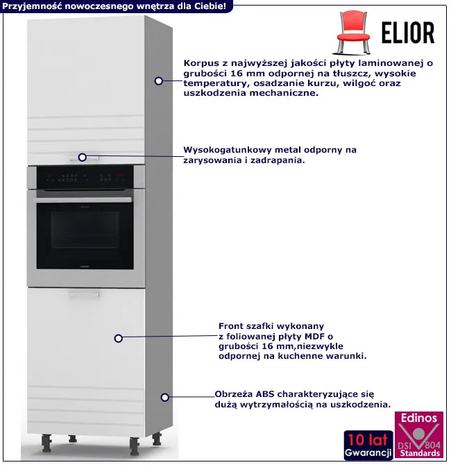 Kolekcję mebli kuchennych Sergio marki Elior wykonano z dbałością o najdrobniejszy szczegół, aby każda z szafek cieszyła Cię niezmiennie latami. Funkcjonalność i najwyższej jakości materiały połączono z nowoczesnym designem. Fronty ozdobiono stylowym frezowaniem, które dodaje kolekcji nietuzinkowego uroku. Wykonano je z najwyższej jakości płyty MDF o grubości 16 mm, specjalnie foliowanej. Materiał ten idealnie sprawdzi się w trudnych warunkach kuchennych i nie straszne mu uderzenia czy tłuste opary i wysoka temperatura. Białe matowe fronty idealnie kontrastują z szarym korpusem. Wykonano go z niezwykle trwałej płyty laminowanej 16 mm grubości marki Elior dedykowanej wnętrzom kuchennym. Szafki posiadają mocne uchwyty stworzone z wysokogatunkowego metalu, a do ich produkcji wykorzystano także niezwykle trwałe obrzeża ABS. W kolekcji Sergio znajdziesz szafkę z najwyższej jakości szkłem podwójnie hartowanym o eleganckim satynowym wykończeniu, która może stanowić idealne miejsce na zastawę stołową. Natomiast górne szafki otwierane do góry zawierają specjalne gazowe podnośniki. Postaw na jakość kolekcji Sergio, która sprawi Ci niezmierną przyjemność.