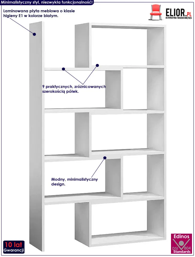 Regał stojący Inglis 3X to mebel charakteryzujący się minimalistycznym designem, a także mocną oraz stabilną konstrukcją. Szafka wykonana została z laminowanej płyty meblowej o klasie higieny E1, uszlachetnionej cienkimi filmami melaminowymi. Posiada także specjalne włókna ułożone różnokierunkowo o strukturze sinusoidalnej, co zapewnia nadanie jej cech jakościowych oraz wytrzymałościowych. Uważaj na podobne produkty innych producentów, wykonane z importowanej, chińskiej i papierowej płyty MDF, które łamią się przy lekkim stuknięciu w korpus. Tylko jakość mebli marki Edinos Premium potwierdzona jest aż 10-letnią gwarancją! Stonowana kolorystyka i prosta forma sprawiają, że regał Irvan doskonale nadaje się do wnętrz mieszkalnych lub komercyjnych urządzonych w stylu skandynawskim, jak też minimalistycznym czy nowoczesnym. Świetnie pasuje także do pokoi dziecięcych czy młodzieżowych. Stwórz w swoim domu niepowtarzalny i ciepły klimat z regałem marki Edinos Premium!