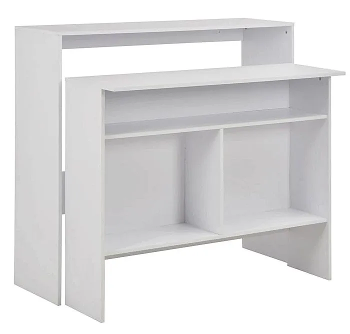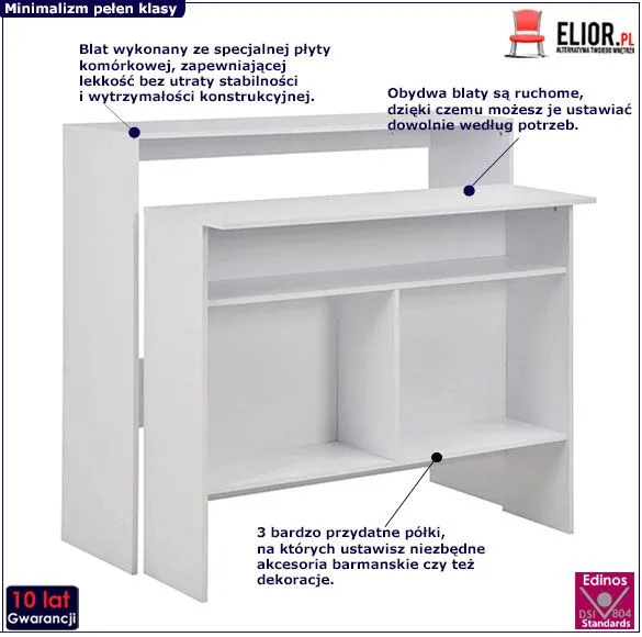 Stoły barowe w modelu Alexander składają się z 2 ruchomych blatów, które można ustawić w różnych konfiguracjach wedle potrzeby, co możesz zobaczyć na załączonych zdjęciach. Zewnętrzny, większy blat ma wymiary: 130 cm x 40 cm x 120 cm (wysokość). Pod nim ukryty jest mniejszy, o wysokości 100 cm i długości 124 cm. Możesz zostawić jeden pod drugim, by mieć dostęp do głównego blatu z 3 półkami tuż pod ręką lub też rozstawić je bardziej przestrzennie, np. prostopadle i stworzyć swój kącik barowy. Dzięki tej elastyczności, nasz stół Alexander nadaje się do wielu pomieszczeń i pozwala na pomysłowe obejście ograniczeń metrażowych. Model Nexa 2X jest cały biały co wywołuje wrażenie schludności, lekkości i pasuje do wielu wystrojów: minimalistycznego, romantycznego, nowoczesnego. Możesz zaaranżować jego otoczenie oraz udekorować go przedmiotami tak, by lokal nabrał niepowtarzalnego, wyrazistego stylu, który zachwyci gości czy to w przestrzeni prywatnej czy biznesowej.