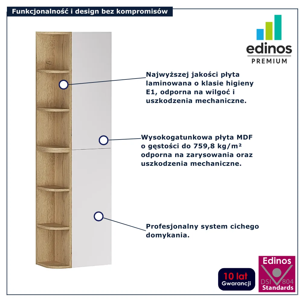 • Produkt posiada certyfikat jakości "Edinos Standards DSI 804", który potwierdza najwyższą jakość wykonania mebla oraz pełny stopień zgodności poszczególnych jednostek wytworzonego wyrobu z przyjętym wzorcem.