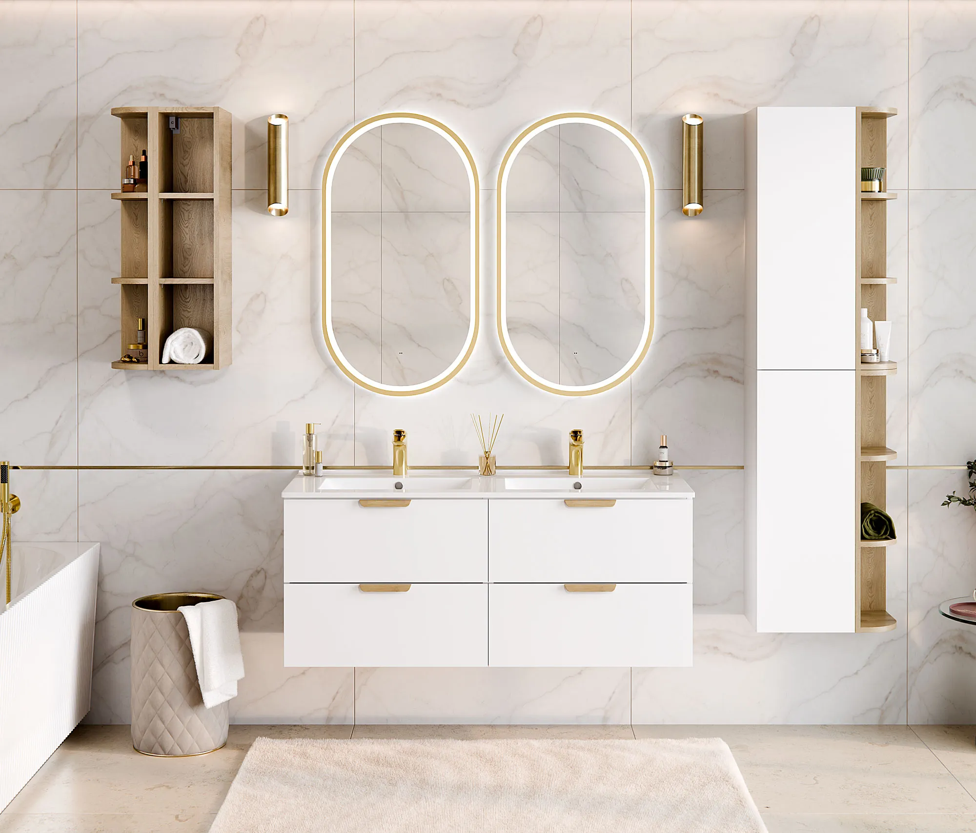 Aranżacja łazienki z kolekcją białych mebli łazienkowych Verdessa
