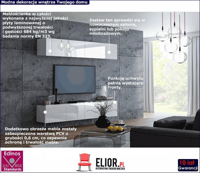 Meblościanka została wykonana z jednego, naturalnego i trwałego materiału, którym jest najwyżej jakości płyta laminowana o podwyższonej trwałości i gęstości. Zbudowana została z włókien drzewnych i związków organicznych w warunkach wysokiego ciśnienia i temperatury. Włókna ułożone są różnokierunkowo, o strukturze sinusoidalnej, co zapewnia nadanie jej cech jakościowych oraz wytrzymałościowych. Dodatkowo półkę oklejono specjalistyczną warstwą ochronną PCV, cechującą się ponadprzeciętną odpornością na zarysowania. Ponadto ten zabieg sprawił, że prezentuje się on wyjątkowo estetycznie i elegancko. Meble produkowane z płyt laminowanych charakteryzują się naturalnością i trwałością, dzięki czemu meble produkowane przez wykonawców marki Elior są całkowicie bezpieczne dla ludzi i środowiska. Dodatkową zaletą prezentowanego przez są subtelne uchwyty, których funkcję pełnią wysunięte fronty oraz system zamykania wyposażony w cichy domyk.