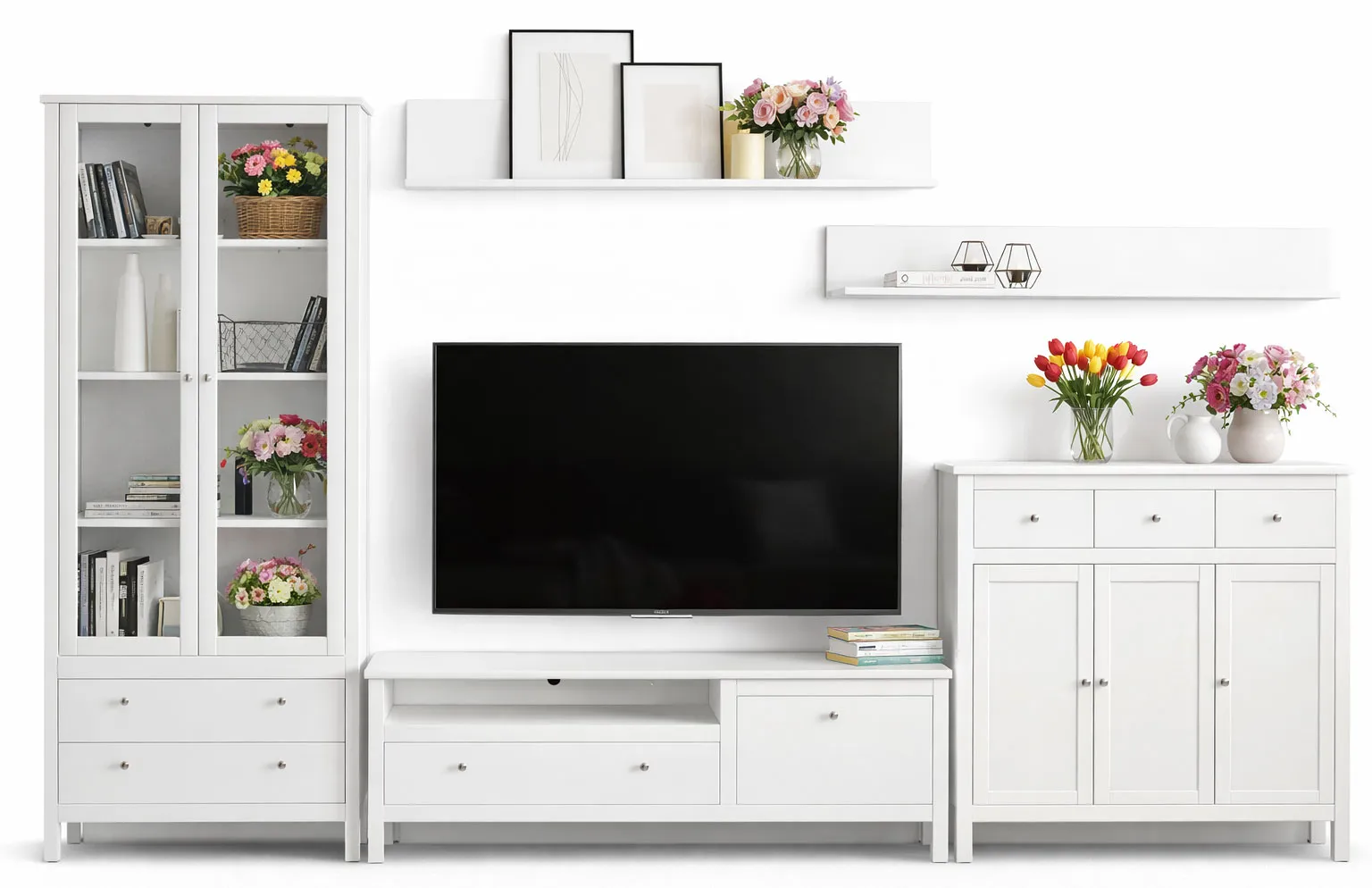 • Wszechstronne Przechowywanie: Zestaw oferuje różnorodne opcje przechowywania, od szafki RTV po komodę i witrynę podświetlaną.