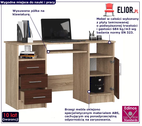 Zależy Ci na komforcie i łatwości w nabywaniu nowych informacji? Zadbaj więc nie tylko i jakość wiedzy jaką zdobywasz, ale również o wysokogatunkowe meble, które dobierzesz do aranżacji wnętrza Twojego domu. Prezentowany przez nas mebel w całości został wykonany z płyty laminowanej o podwyższonej trwałości i gęstości. Włókna ułożone są różnokierunkowo, o strukturze sinusoidalnej, co zapewnia nadanie jej cech jakościowych oraz wytrzymałościowych. Dodatkowo płyta została uszlachetniona cienkimi filmami melaminowymi w celu zwiększenia jej trwałości. Brzegi mebla oklejono specjalistycznym materiałem ABS, cechującym się ponadprzeciętną odpornością na zarysowania. Ponadto ten zabieg sprawił, że mebel prezentuje się wyjątkowo estetycznie. Dodatkowo biurko zostało wyposażone w antypoślizgowe wykończenie podstawy, które zabezpieczy podłogi Twojego domu przed zarysowaniem i uszkodzeniami mechanicznymi.