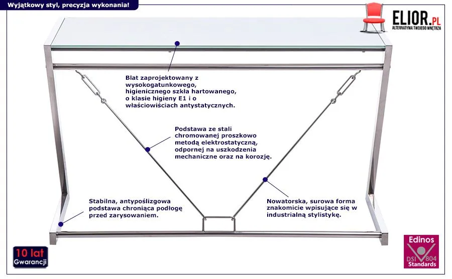 Zaprojektowane z designerską wyobraźnią biurko Iksor powstało z wysokiej klasy, starannie dobranych i trwałych materiałów meblarskich. Dzięki temu użytkuje się go naprawdę wygodnie i przyjemnie. Blat Iksora wykonano z wysokiej jakości, odpornego na zarysowania szkła hartowanego o klasie higieny E1 i o właściwościach antystatycznych. To niezwykle wytrzymały i innowacyjnie prezentujący się surowiec meblarski. Lakierowana podstawa w znakomitym kształcie litery Z, na której osadzono trwały blat to stal chromowana proszkowo metodą elektrostatyczną, oporna na uszkodzenia mechaniczne i korozję. Profesjonalna obróbka szkła oraz stali zapewnia bezpieczne użytkowanie biurka przez lata. Iksor zapewnia zdrowe środowisko do nauki i pracy. Podstawa, na której osadzono mebel, chroni podłogę przed zarysowaniem. Charakteryzuje się ona stabilnością, dzięki czemu biurko wyróżnia ponadprzeciętna trwałość.To ważne, by meble pracownicze były naprawdę wytrzymałe i funkcjonalne. Na szczęście z modernistycznym, komfortowym biurkiem Iksor w gustownej bieli blatu i industrialnej, srebrnej odsłonie podstawy nie trzeba się o to martwić. Świetna jakość wykonania mebla to gwarancja wieloletniego użytkowania bez jego uszkodzeń. Modnym i starannie zaprojektowanym biurkiem Iksor o jakże nietypowej i odważnej formie możesz cieszyć się niezmiennie i wciąż na nowo.