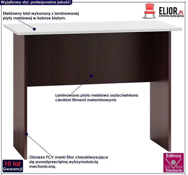 Efektowne biurko Luniko marki Elior to idealna propozycja dla osób doceniających wysoki komfort podczas pracy przy komputerze. Użyta do produkcji mebla laminowana płyta meblowa w kolorach białym oraz wenge została uszlachetniona cienkimi filmami melaminowymi. Posiada także specjalne włókna ułożone różnokierunkowo o strukturze sinusoidalnej, co zapewnia nadanie jej cech jakościowych oraz wytrzymałościowych. Dla zwiększenia wytrzymałości mebla, obrzeża biurka wykończono odpornym na uszkodzenia mechaniczne tworzywem PCV. Stonowana kolorystyka i prosta forma sprawiają, że biurko Luniko doskonale sprawdza się we wnętrzach urządzonych w stylu skandynawskim, jak też minimalistycznym czy nowoczesnym. Świetnie nadaje się także do wnętrz dziecięcych czy młodzieżowych. Stwórz w swoim domu niepowtarzalny i ciepły klimat z meblem marki Elior!