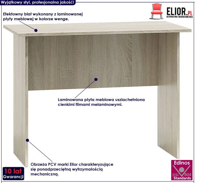 Efektowne biurko Luniko marki Elior to idealna propozycja dla osób doceniających wysoki komfort podczas pracy przy komputerze. Użyta do produkcji mebla laminowana płyta meblowa w kolorze dąb sonoma została uszlachetniona cienkimi filmami melaminowymi. Posiada także specjalne włókna ułożone różnokierunkowo o strukturze sinusoidalnej, co zapewnia nadanie jej cech jakościowych oraz wytrzymałościowych. Dla zwiększenia wytrzymałości mebla, obrzeża biurka wykończono odpornym na uszkodzenia mechaniczne tworzywem PCV. Stonowana kolorystyka i prosta forma sprawiają, że biurko Luniko doskonale sprawdza się we wnętrzach urządzonych w stylu skandynawskim, jak też minimalistycznym czy nowoczesnym. Świetnie nadaje się także do wnętrz dziecięcych czy młodzieżowych. Stwórz w swoim domu niepowtarzalny i ciepły klimat z meblem marki Elior!