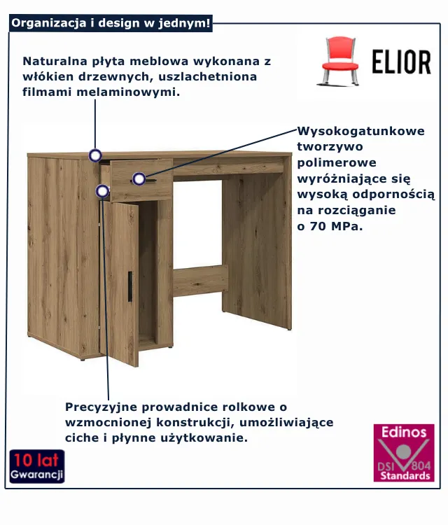 • 1 pojemna szuflada i 1 praktyczna szafka – idealne na dokumenty, akcesoria i inne niezbędne drobiazgi.