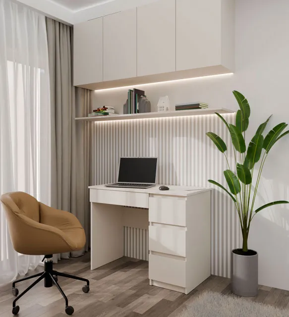 Dzięki przemyślanej konstrukcji, biurko Agoni 4X świetnie sprawdzi się w biurze, gabinecie, pracowni, pokoju młodzieżowym czy salonie. Przestronny blat zapewni idealne miejsce do pracy. Bez problemu pomieścisz na nim laptopa, lampkę, dokumenty i inne przybory. 3 pojemne szuflady z prawej strony oraz jedna z lewej strony, umieszczona zaraz pod blatem, dostarczą dużą ilość przestrzeni do przechowywania dokumentów, zeszytów oraz wszelkich innych przedmiotów, które potrzebujesz mieć zawsze pod ręką. Uniwersalny kolor, prosta i nowoczesna konstrukcja oraz gładkie boki bez zaślepek skutecznie podkreślają minimalistyczny charakter biurka, dzięki czemu będzie świetnie współgrać z pozostałymi meblami znajdującymi się w pomieszczeniu. Doskonale wkomponuje się w otoczenia urządzone w stylu skandynawskim, minimalistycznym, nowoczesnym lub loftowym. Do produkcji Agoni 4X zostały wykorzystane wyłącznie starannie wyselekcjonowane materiały, dzięki temu biurko będzie służyć Ci nieprzerwanie przez wiele lat, nieustannie prezentując swoją wysoką jakość!