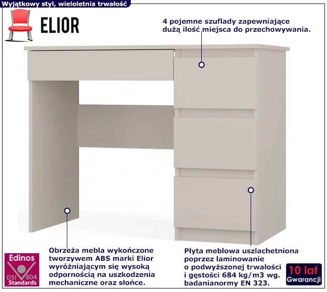 - Modna kolorystyka: Kaszmir. Kliknij w link i sprawdź także inne inne biurka z szufladami w sklepie Edinos.pl. Stwórz swój praktyczny zestaw mebli.