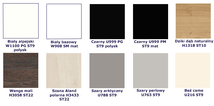 2. Kolor wybrany spośród widocznej palety barw (możliwość użycia innego koloru dla blatu oraz korpusu biurka)