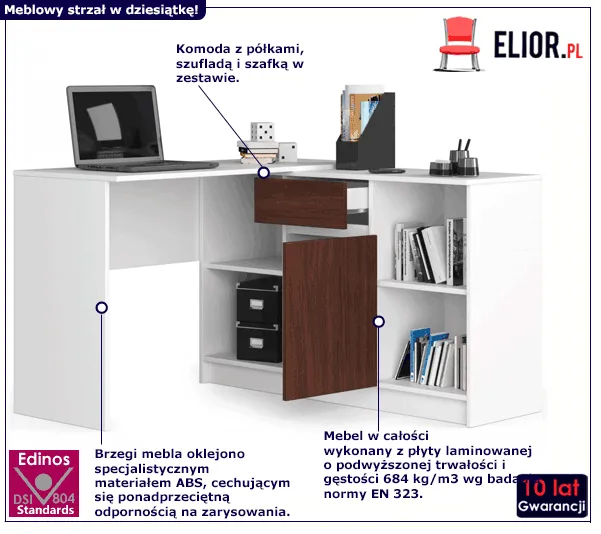 Każdy sklep meblowy sprzedaje meble, ale nie każdy sklep meblowy posiada produkty marki Elior. A w szczególności takie jak biurko Wilma 4X, które charakteryzuje subtelność, gust a przede wszystkim funkcjonalność i wszechstronna użyteczność. Zamów je już dzisiaj i ciesz się podjętą decyzją w niebywale niskiej cenie 838 zł. Wysoka jakość i niska cena - ten zakup to czysta logika!