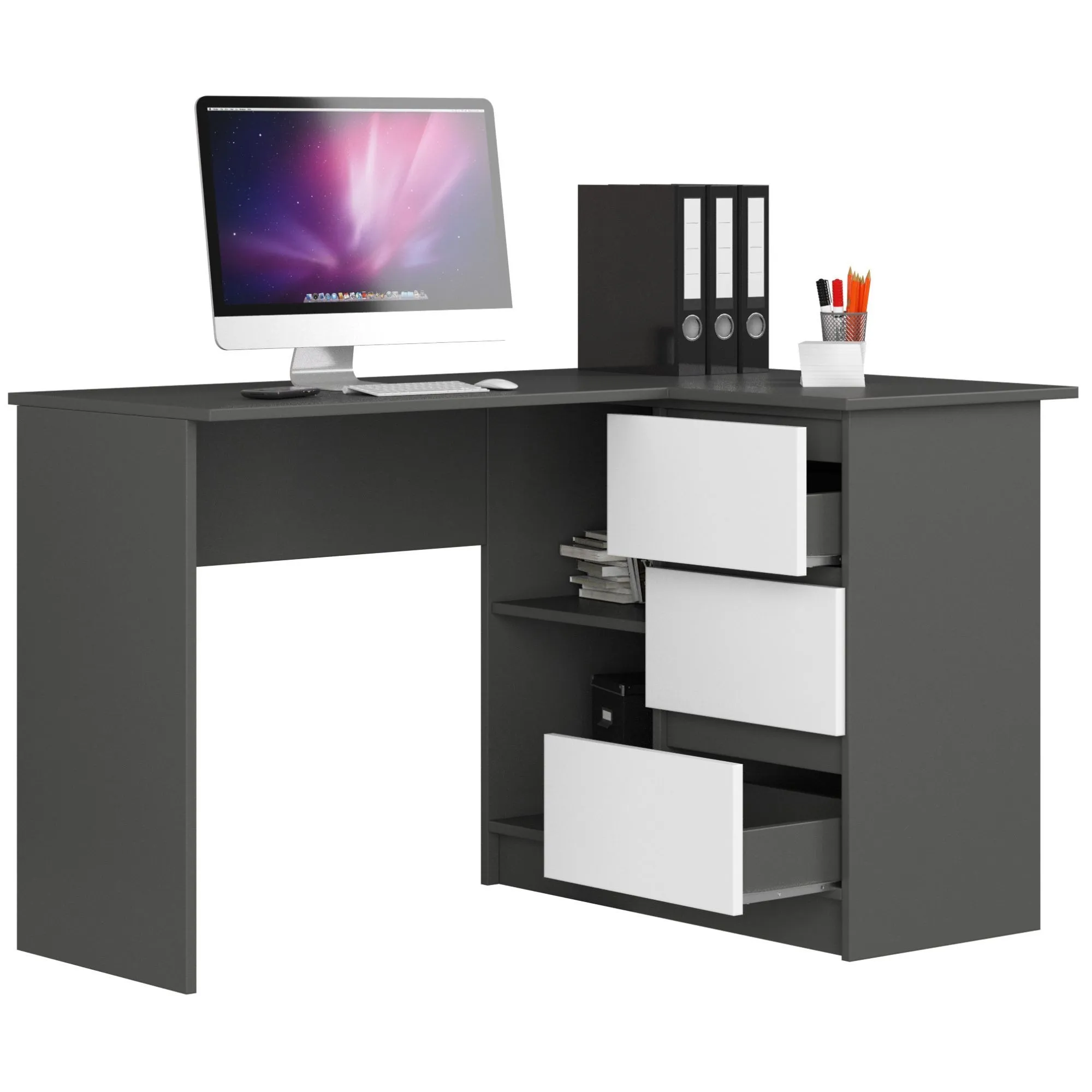 W domach, mieszkaniach i biurach coraz częściej zauważyć można biura narożne. Są nie tylko modne, ale też funkcjonalne. Osoby, które szukają mebli w szarym odcieniu z białymi frontami, mogą skusić się na biurko narożne B16 o szerokości 124 cm. Świetnie nadaje się do nauki lub wykonywania obowiązków zawodowych, a jednocześnie ma nowoczesny wygląd. Zawiera półki i szuflady, w których umieścić można dokumenty, książki, akcesoria biurowe i wiele innych. Mebel cechuje się trwałością. Jest przeznaczony do samodzielnego montażu, co nie sprawia większej trudności, gdyż do każdego zamówienia dołączana jest instrukcja.