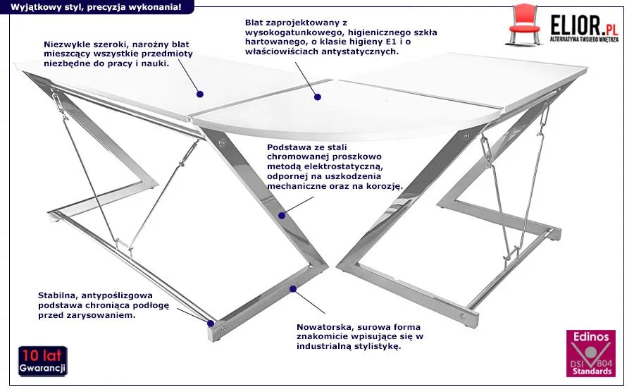 Zaprojektowane z designerską wyobraźnią biurko Iksor 2 powstało z wysokiej klasy, starannie dobranych i trwałych materiałów meblarskich. Dzięki temu użytkuje się go naprawdę wygodnie i przyjemnie. Blat Iksora 2 wykonano z wysokiej jakości, odpornego na zarysowania szkła hartowanego o klasie higieny E1 i o właściwościach antystatycznych. To niezwykle wytrzymały i innowacyjnie prezentujący się surowiec meblarski. Lakierowana podstawa w znakomitym kształcie litery Z, na której osadzono trwały blat to stal chromowana proszkowo metodą elektrostatyczną, oporna na uszkodzenia mechaniczne i korozję. Profesjonalna obróbka szkła oraz stali zapewnia bezpieczne użytkowanie biurka przez lata. Iksor 2 zapewnia zdrowe środowisko do nauki i pracy. Podstawa, na której osadzono mebel, chroni podłogę przed zarysowaniem. Charakteryzuje się ona stabilnością, dzięki czemu biurko wyróżnia ponadprzeciętna trwałość. To ważne, by meble pracownicze były naprawdę wytrzymałe i funkcjonalne. Na szczęście z modernistycznym, komfortowym biurkiem Iksor 2 w gustownej bieli blatu i industrialnej, srebrnej odsłonie podstawy nie trzeba się o to martwić. Świetna jakość wykonania mebla to gwarancja wieloletniego użytkowania bez jego uszkodzeń. Modnym i starannie zaprojektowanym biurkiem Iksor 2 o jakże nietypowej i odważnej formie możesz cieszyć się niezmiennie i wciąż na nowo.