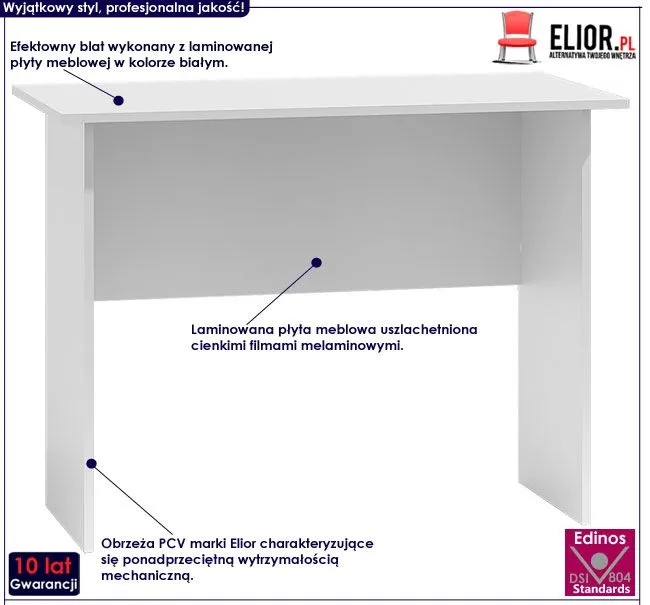 Efektowne biurko Luniko marki Elior to idealna propozycja dla osób doceniających wysoki komfort podczas pracy przy komputerze. Użyta do produkcji mebla laminowana płyta meblowa w kolorze białym została uszlachetniona cienkimi filmami melaminowymi. Posiada także specjalne włókna ułożone różnokierunkowo o strukturze sinusoidalnej, co zapewnia nadanie jej cech jakościowych oraz wytrzymałościowych. Dla zwiększenia wytrzymałości mebla, obrzeża biurka wykończono odpornym na uszkodzenia mechaniczne tworzywem PCV. Stonowana kolorystyka i prosta forma sprawiają, że biurko Luniko doskonale sprawdza się we wnętrzach urządzonych w stylu skandynawskim, jak też minimalistycznym czy nowoczesnym. Świetnie nadaje się także do wnętrz dziecięcych czy młodzieżowych. Stwórz w swoim domu niepowtarzalny i ciepły klimat z meblem marki Elior!
