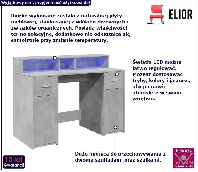 Twoja przestrzeń do pracy i nauki może stać się nie tylko funkcjonalna, ale i pełna nowoczesnego charakteru. Odpowiednie biurko to klucz do komfortu i organizacji. Biurko Duna marki Edinos Premium to wyjątkowy mebel w eleganckim odcieniu szarego betonu, które łączy praktyczność z efektownym designem. Dzięki wbudowanemu oświetleniu LED możesz dostosować barwę i jasność światła, tworząc atmosferę dopasowaną do Twoich potrzeb. Niezależnie od tego, czy pracujesz, uczysz się, czy relaksujesz, odpowiednie podświetlenie sprawi, że Twoje otoczenie nabierze zupełnie nowego wymiaru. Przemyślana konstrukcja z pojemnymi szafkami, szufladami i dodatkową półką nad blatem pozwala zachować porządek i mieć wszystko, co najważniejsze, w zasięgu ręki.