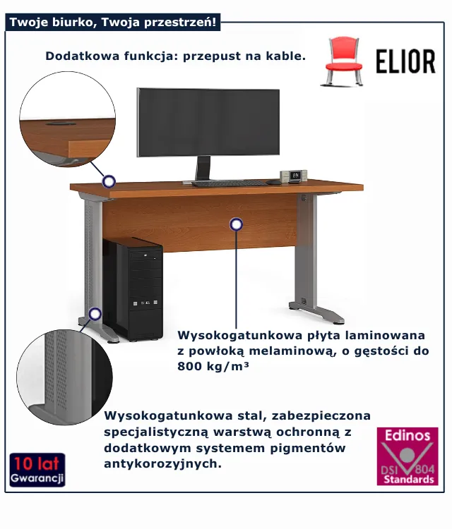 Twój domowy kącik do pracy zasługuje na mebel, który łączy praktyczność z elegancją. Biurko Rook marki Edinos Premium to propozycja dla tych, którzy cenią sobie minimalistyczny styl, ale nie chcą rezygnować z trwałości i wygody. Dzięki uniwersalnej formie pasuje zarówno do nowoczesnych, jak i bardziej klasycznych wnętrz. Masz dość bałaganu na blacie i plątaniny kabli? Przepust na przewody oraz wykończony tył biurka rozwiązują te problemy. A może szukasz mebla, który będzie równie wytrzymały, co stylowy? Czas postawić na rozwiązanie, które nie tylko spełni Twoje oczekiwania, ale też nada charakteru przestrzeni.