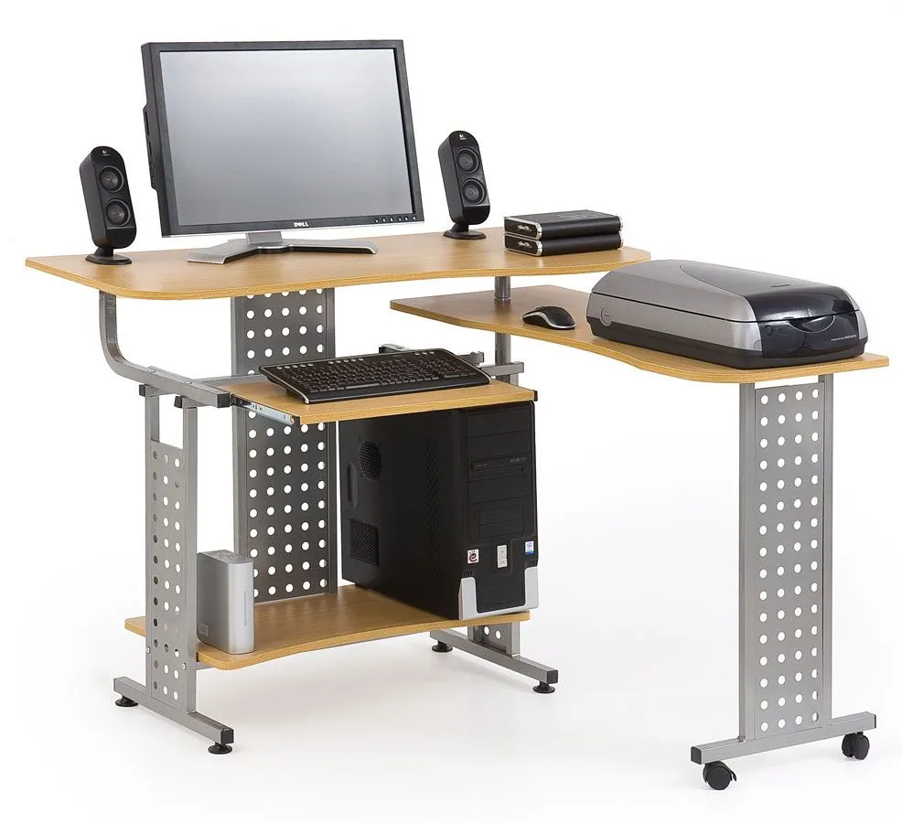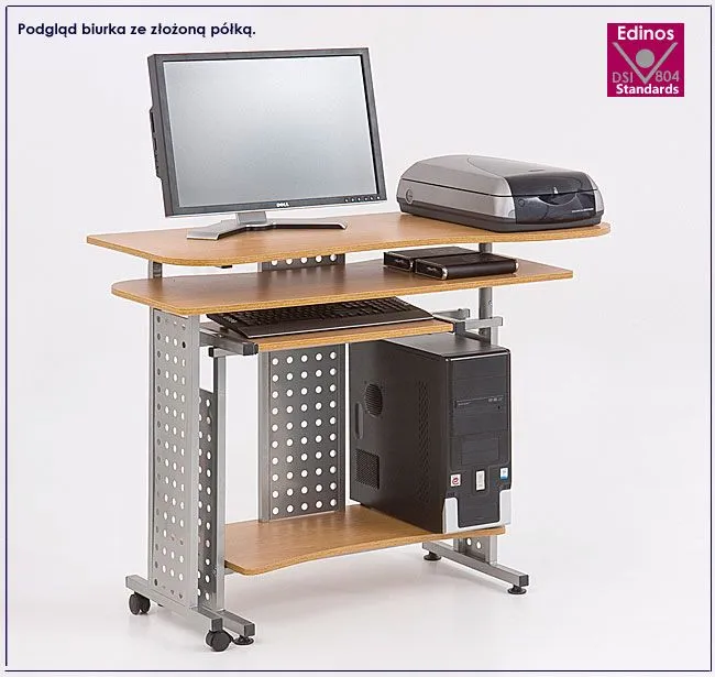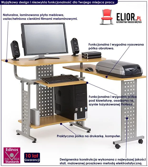 Komfortowe biurko Erica 3X wyróżnia się nie tylko swoją praktyczną formą i funkcjonalnym, designerskim kształtem, ale także zastosowaniem materiałów najlepszej jakości. To dlatego cieszy się powodzeniem wśród osób lubiących nowatorskie rozwiązania. Użyta do produkcji mebla płyta laminowana została uszlachetniona cienkimi filmami melaminowymi. Posiada także najwyższej jakości włókna ułożone różnokierunkowo, co zapewnia nadanie jej cech jakościowych oraz wytrzymałościowych. Biurko wyposażone zostało w specjalne półki na komputer, drukarkę, klawiaturę oraz mniejsze akcesoria. Mebel nie zajmuje wiele miejsca i wyjątkowo dobrze sprawdza się właśnie do pracy przy komputerze.