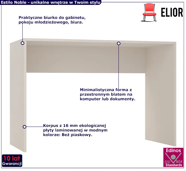 Kolekcja Estilo Noble marki Elior to nowatorskie i kompleksowe rozwiązanie dedykowane osobom, które cenią jakość, dobry design i mają zmysł dekoratorski. Estilo Noble pozwala wykreować wnętrze dopasowane do indywidualnych potrzeb i gustów, tak doskonale jakby było dziełem profesjonalnego dekoratora wnętrz i stolarza jednocześnie. Linia mebli Estilo Noble to nieograniczone możliwości konfiguracji bogatego wachlarza modeli szafek, dekorów i kolorów frontów i paneli oraz wariantów nóżek! Estilo Noble składa się z 12 bazowych mebli przeznaczonych do salonu, sypialni, gabinetu i przedpokoju oraz 5 wzorów paneli ściennych. Poznaj pierwszą propozycję z kolekcji - biurko beż piaskowy Estilo Nerja 3X!