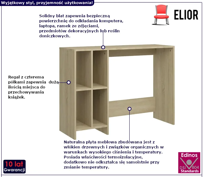 Biurko Medios marki Edinos Premium to doskonałe rozwiązanie dla tych, którzy potrzebują funkcjonalnego i stylowego mebla, który nie zajmie zbyt wiele miejsca. Jego prosta konstrukcja łączy elegancję z praktycznością, a cztery półki na książki zapewniają dużo miejsca do przechowywania. Dzięki swojej wąskiej formie, biurko Medios idealnie dopasuje się nawet do najmniejszych przestrzeni, czyniąc je idealnym wyborem do mieszkań, kawalerek i domowych biur.