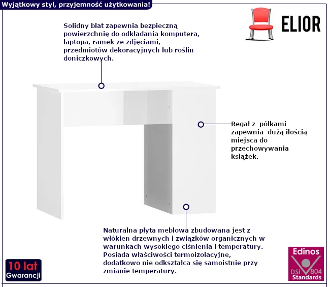 • Kolor: biały z połyskiem. W naszej ofercie posiadamy także inne biurka.