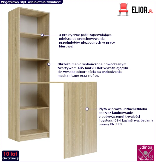 Zapewne widząc połączenie biurka z regałem nasuwa Ci się pytanie: "Czy taka kombinacja jest trwała?". Konstrukcja biurka Limes została zaprojektowana przez wykwalifikowanych specjalistów marki Edinos Premium, którzy dołożyli wszelkich starań, aby mebel ten był zarówno wytrzymały, jak i praktyczny. Korpus oraz front zostały wykonane z najwyższej jakości płyty wiórowej odpornej na uszkodzenia mechaniczne. Głównym jej budulcem jest drewno, które zostało sprasowane z żywicami w warunkach wysokiej temperatury i ciśnienia. Dodatkowo płyta została uszlachetniona poprzez laminowanie o podwyższonej trwałości i gęstości. Ogromną zaletą płyt wiórowych jest także ich duża stałość wymiarowa oraz zwiększona odporność na ogień, działanie grzybów i pleśni czy żerowanie owadów co daje Ci całkowitą na pewność związaną z długotrwałym użytkowaniem mebla. Obrzeża mebla zostały wykończone nowoczesnym tworzywem ABS charakteryzującym się dużą wytrzymałością na uszkodzenia mechaniczne, a także na działanie promieni słonecznych.
