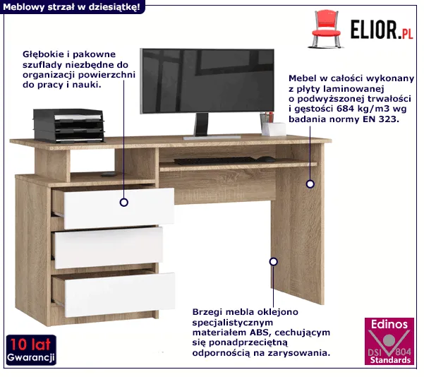 To bez znaczenia! Ponieważ prezentowane przez nas biurko dostosowane jest zarówno do nauki z książek, zeszytów, pracy nad projektami i rysunkami oraz do nauki z użyciem komputera. Optymalne wymiary blatu pozwolą Ci na swobodne operowanie, pisanie i rozłożenie istotnych notatek. Trzy głębokie szuflady sprawią, że znajdziesz odpowiednie miejsce dla zeszytów, materiałów i akcesoriów biurowych zachowując przy tym porządek i przemyślaną organizację przestrzeni w pomieszczeniu. Komfortowa półka znajdująca się pod blatem biurka pozwoli Ci na umieszczenie w niej drobiazgów, które chciałbyś mieć pod ręką. A wysuwana szuflada to idealne miejsce na klawiaturę i myszkę, która na co dzień nie będzie zajmować miejsca na blacie głównym. Nadal wahasz się czy to odpowiedni mebel dla Ciebie lub Twojego dziecka? Może argumentem, który sprawi, że "będziesz na tak" okaże się uniwersalna kolorystyka, która wpasuje się w wiele aranżacji i długo nie wyjdzie z mody. Ponadczasowy projekt mebla sprawi, że będzie on idealnym elementem umeblowania pokoju dziecięcego, młodzieżowego, biura, gabinetu, pracowni i lokali usługowych.