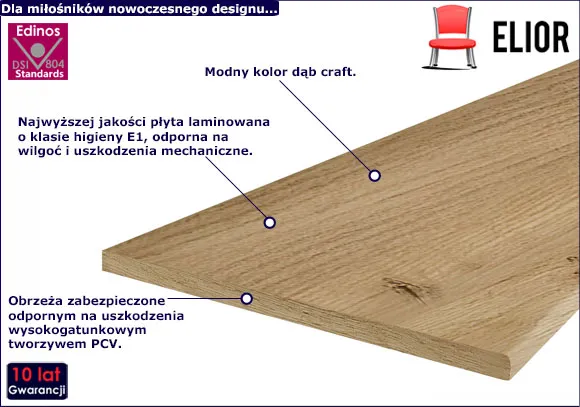 - Materiał: Wysokiej jakości płyta laminowana o klasie higieny E1 odporna na wilgoć i uszkodzenia mechaniczne.