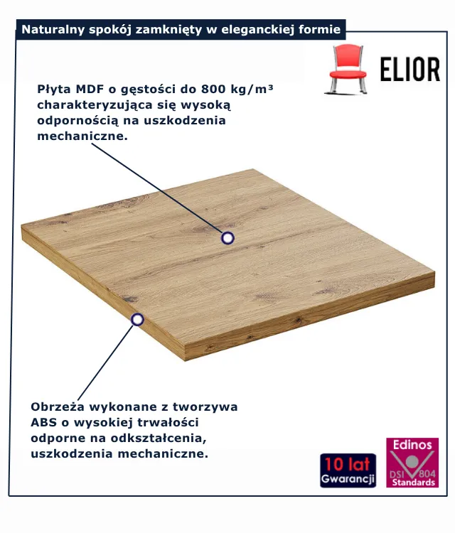 • Produkt posiada certyfikat jakości "Edinos Standards DSI 804", który potwierdza najwyższą jakość wykonania mebla oraz pełny stopień zgodności poszczególnych jednostek wytworzonego wyrobu z przyjętym wzorcem.