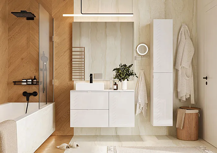 Przenieś swoją łazienkę na wyższy poziom nowoczesności z kolekcją mebli łazienkowych Hortif marki Edinos Premium. Ta wyjątkowa linia to odpowiedź na pragnienie minimalistycznej elegancji, która definiuje współczesne wnętrza. Białe fronty ze skośnymi frezami po lewej stronie tworzą efekt subtelnej asmytrii, dodając przestrzeni wyjątkowego charakteru. Hortif to propozycja dla tych, którzy cenią sobie oryginalność połączoną z prostotą formy. Wykreuj swoje miejsce relaksu, w którym czysty design współgra z funkcjonalnością, nadając każdej chwili spędzonej w łazience odrobinę luksusu.