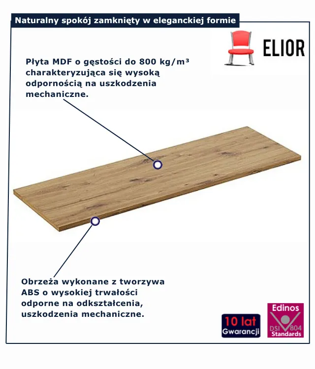 Blat Artiza 10X 140 cm to funkcjonalne uzupełnienie szafki pod umywalkę, które pozwala stworzyć nowoczesny zestaw z umywalką nablatową. Wykonany z trwałej płyty MDF, w dekorze naturalnego dębu, wprowadza do wnętrza ciepły, ponadczasowy charakter i świetnie współgra z kaszmirowym wykończeniem pozostałych elementów serii.