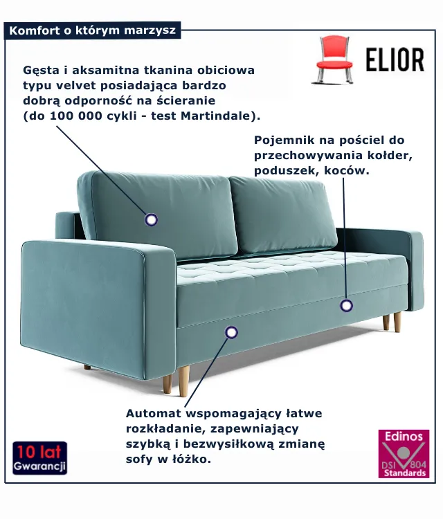 • Welurowa tapicerka - miękka, przyjemna w dotyku i elegancka.