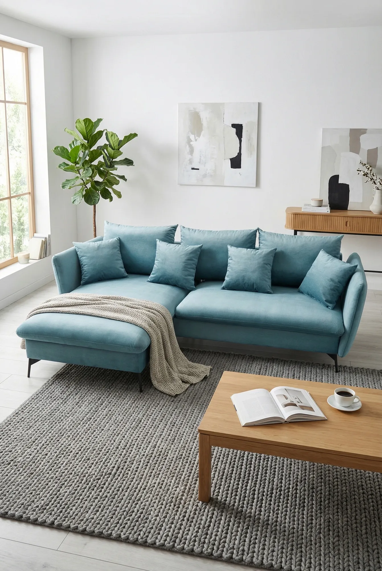Przykładowa aranżacja z błękitnym welurowym narożnikiem Pessio 4X