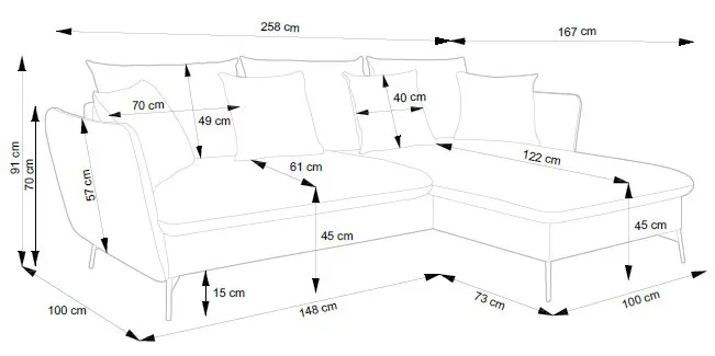 • Szerokość: 258 cm, wysokość: 91 cm, głębokość 167 cm.