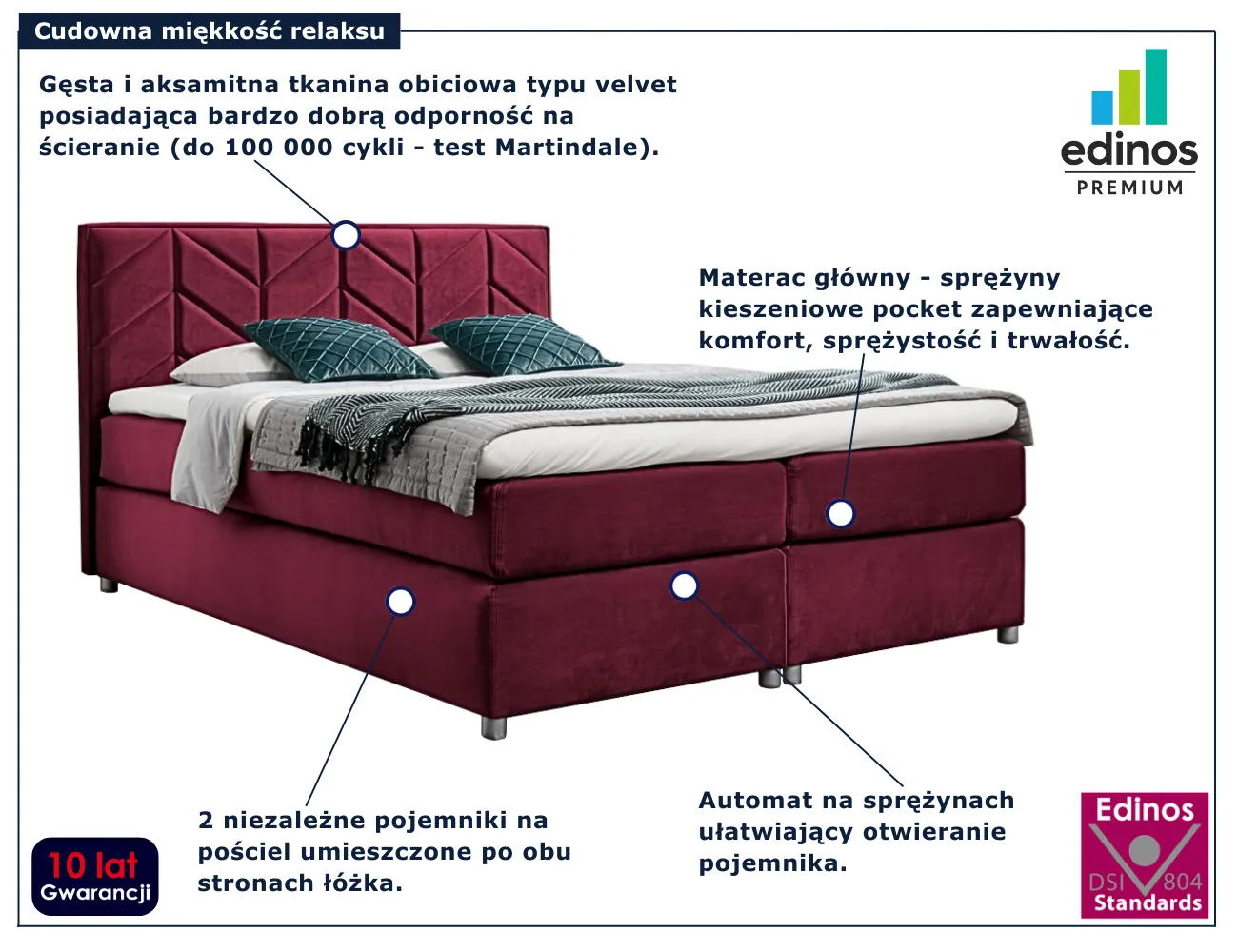 • Produkt posiada certyfikat jakości "Edinos Standards DSI 804", który potwierdza najwyższą jakość wykonania mebla oraz pełny stopień zgodności poszczególnych jednostek wytworzonego wyrobu z przyjętym wzorcem.