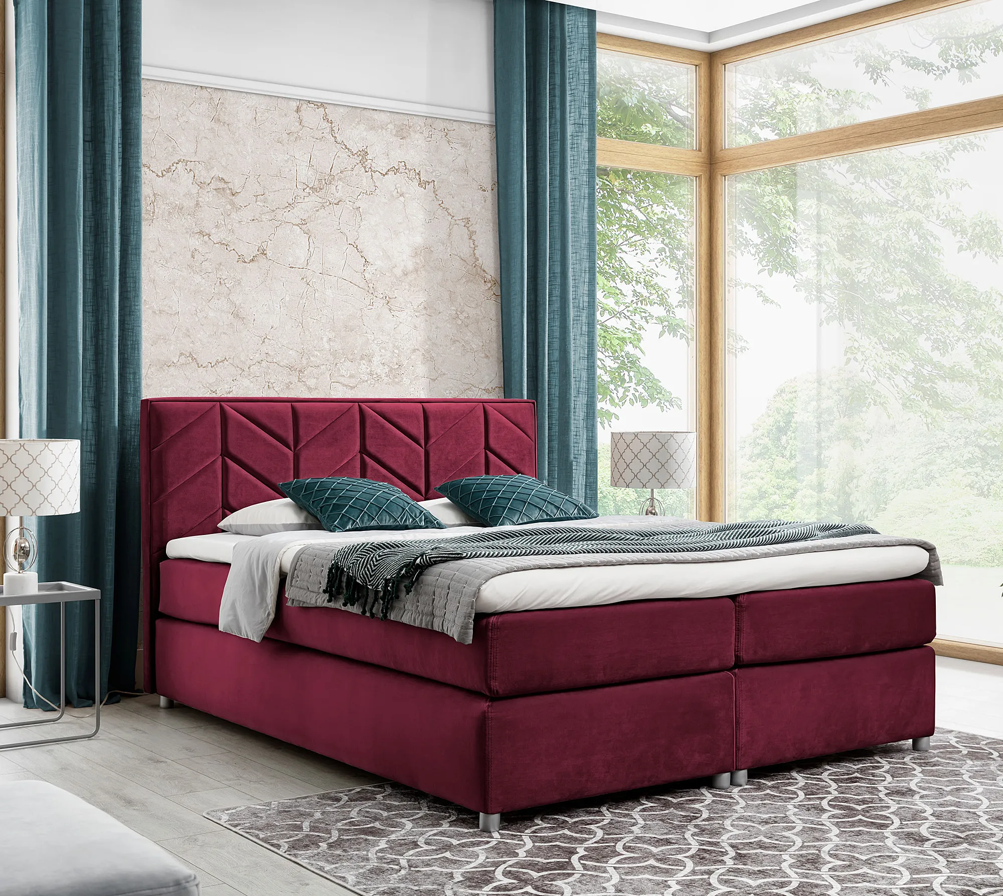 Aranżacja wnętrza z bordowym łóżkiem Ferlevio