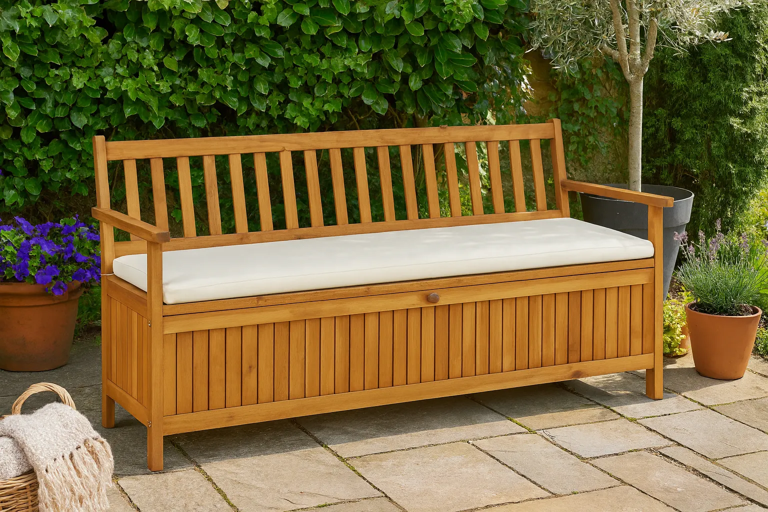 Ławka Kaja została zaprojektowana tak, aby służyć Ci w możliwie funkcjonalny sposób. Duża poduszka w kremowym kolorze zauważalnie zwiększa komfort użytkowania. Dzięki niej będziesz mógł wygodnie rozsiąść się bez obawy o ból ciała czy odciski. Istotnym udogodnieniem jest również pojemny schowek, gdzie umieścisz buty, narzędzia czy inne przedmioty. Dzięki temu elementowi Kaja świetnie sprawdzi się nie tylko jako produkt ogrodowy, ale i praktyczny mebel do przedpokoju. Montaż całości jest niezwykle prosty i nie zajmie Ci dużo czasu. Dzięki profesjonalnemu designowi również konserwacja ławki nie jest trudna. Do czyszczenia jej powierzchni będziesz potrzebować jedynie ściereczki lub papierowego ręcznika. Sam przekonaj się jakie to jest proste!