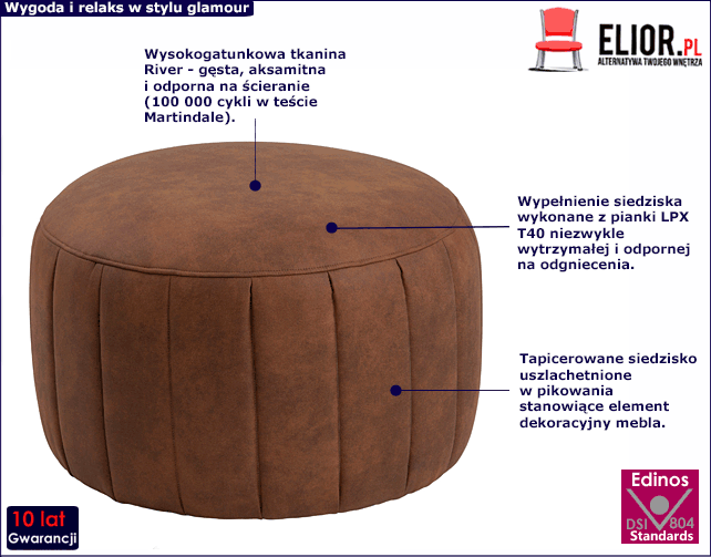 - Modna kolorystyka: ciemnobrązowy. Kliknij w link i sprawdź także inne pufy welurowe w sklepie Edinos.pl. Stwórz swój praktyczny zestaw mebli.