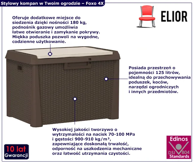 • Kolor skrzyni: Brązowy. Kliknij w link i sprawdź także inne skrzynie ogrodowe w sklepie Edinos.pl. Stwórz swój praktyczny zestaw mebli.