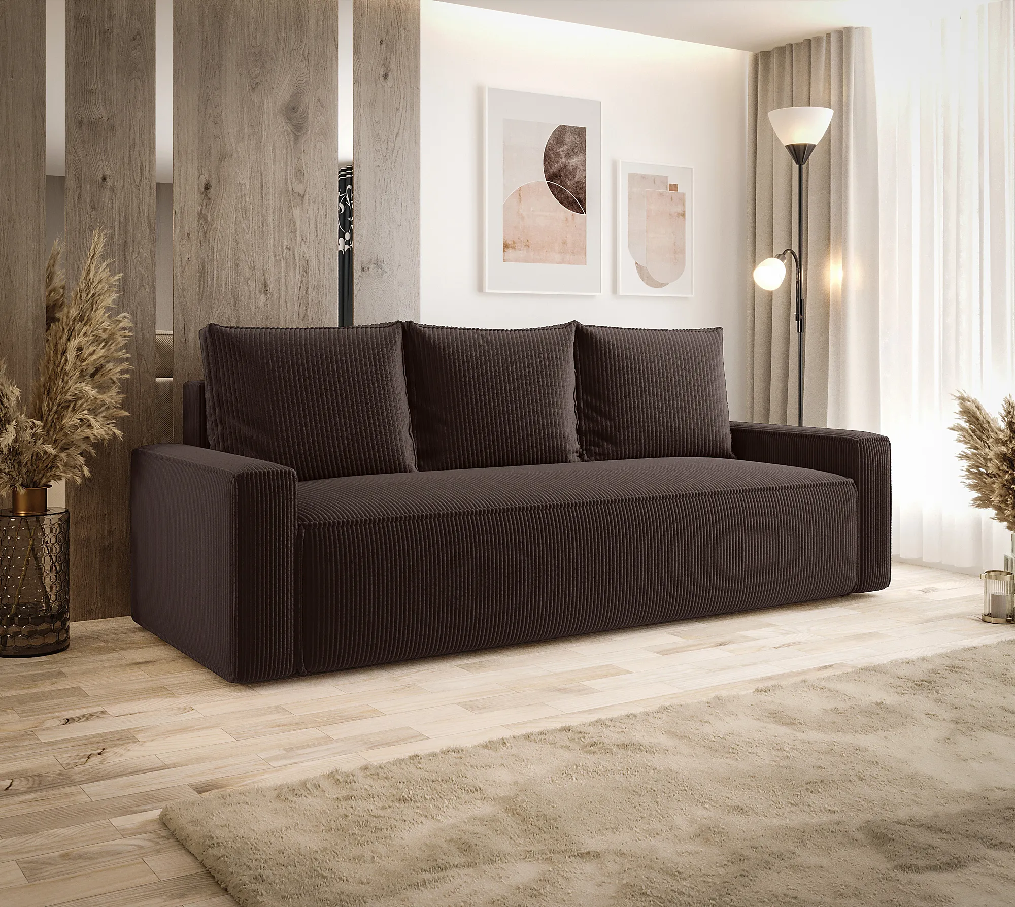 Sofa prezentuje się bardzo nowocześnie, a czarna tapicerka wygląda elegancko i łatwo się ją czyści. Pojemnik jest pojemny, mechanizm lekki. Dostawa ekspres więc ja nie mam żadnych uwag.