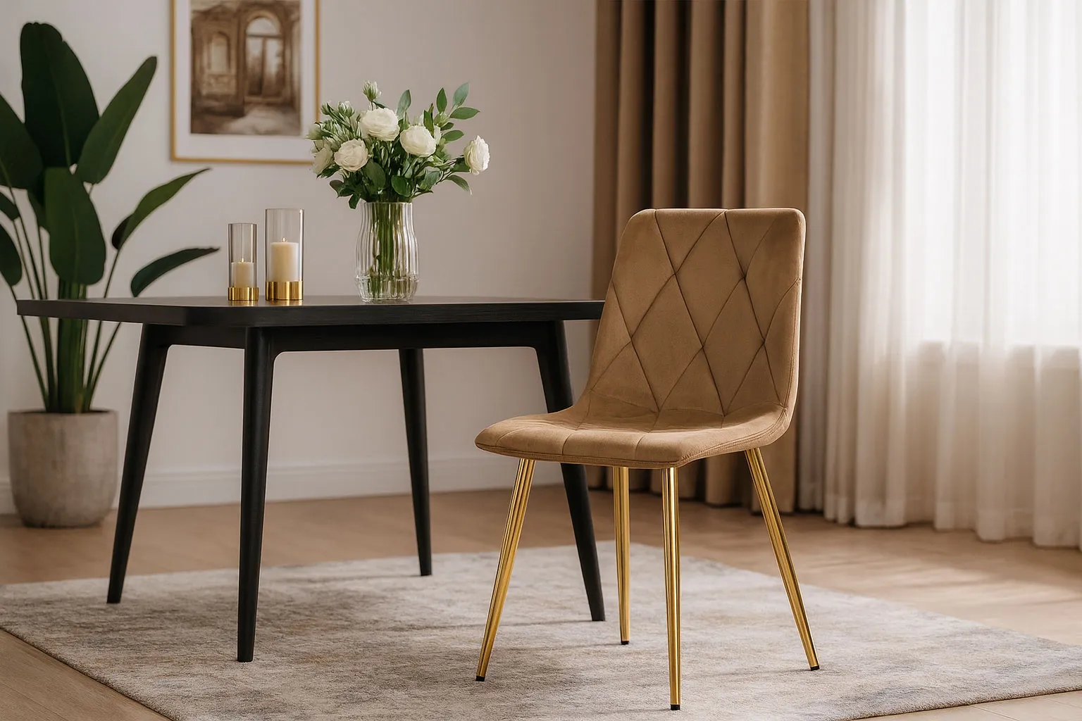 Krzesło tapicerowane na złotych metalowych nogach Zeloti marki Edinos Premium to prawdziwy synonim elegancji i wygody, którego nie sposób przeoczyć. Jego wyrafinowany wygląd natychmiast nadaje wnętrzu wyjątkowego charakteru – złote nogi przyciągają spojrzenia i dodają luksusowego blasku, a miękkie welurowe siedzisko zapewnia komfort, który docenisz podczas codziennych posiłków i długich rozmów przy stole. To mebel, który sprawia, że każda chwila spędzona w jadalni czy salonie staje się jeszcze przyjemniejsza.