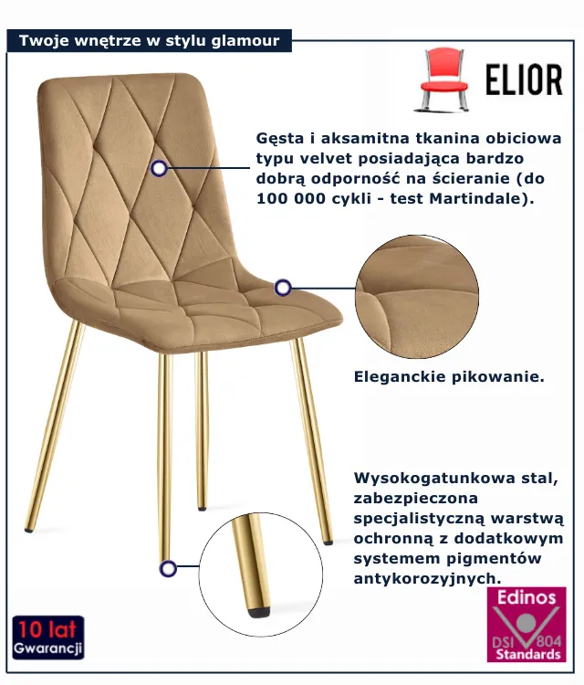• Złote proszkowo malowane nogi dodają krzesłu elegancji.