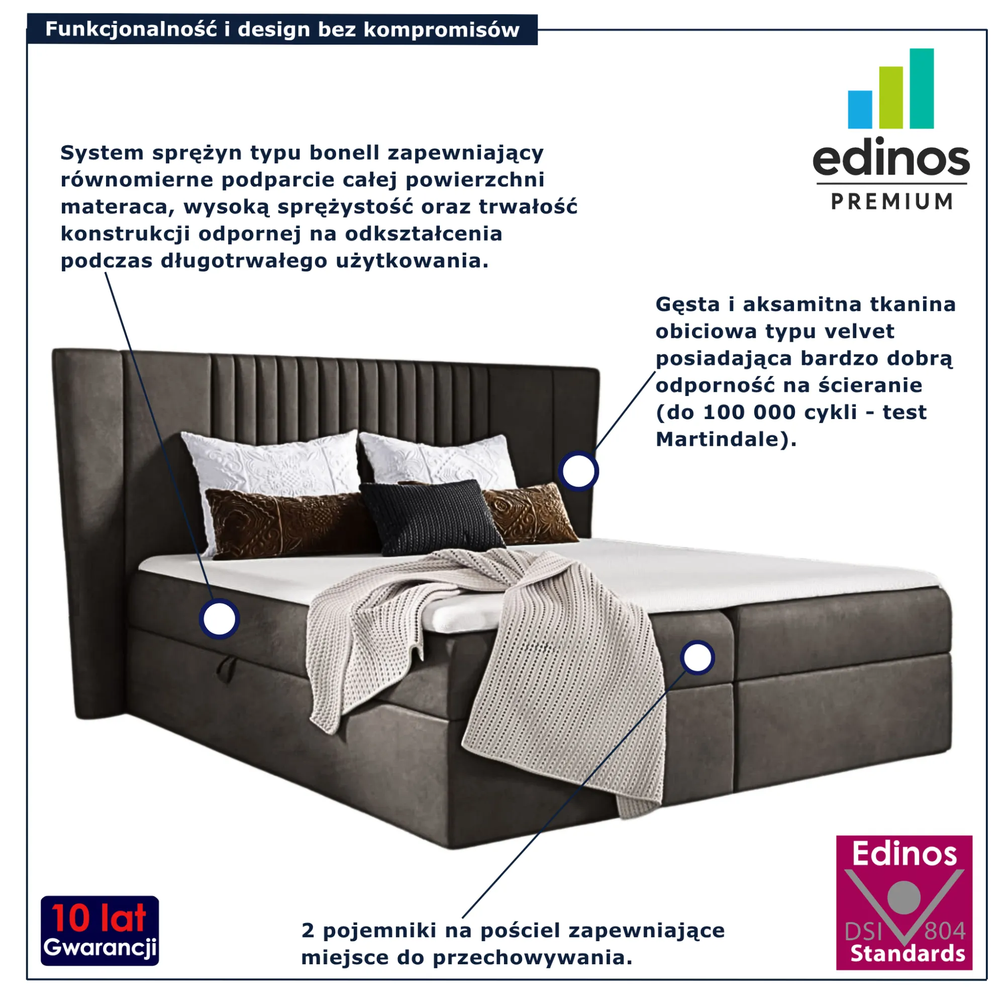 • Produkt posiada certyfikat jakości "Edinos Standards DSI 804", który potwierdza najwyższą jakość wykonania mebla oraz pełny stopień zgodności poszczególnych jednostek wytworzonego wyrobu z przyjętym wzorcem.