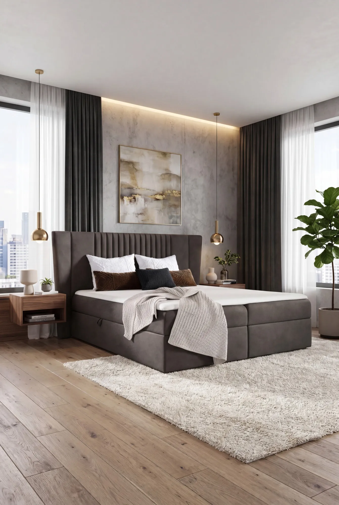Aranżacja sypialni z brązowym łóżkiem kontynentalnym Orlento