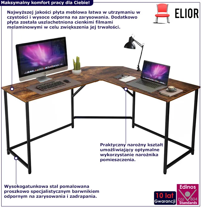 Strzał w dziesiątkę! Jego narożny kształt pozwala zaoszczędzić dużo miejsca, a jednocześnie oferuje wystarczającą przestrzeń dla dwóch osób. Jakość wykonania jest na najwyższym poziomie, a brązowy kolor wprowadza przytulny klimat do mojego biura. Gorąco polecam!