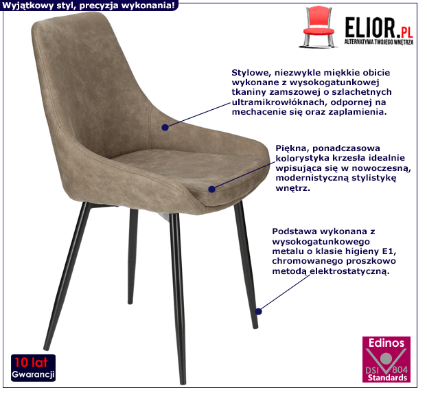Szykowne krzesło Swedo 3X jest meblem cechującym się modną, niezwykle gustowną stylistyką. Jest to zasługa między innymi starannie dobranych i niezwykle trwałych materiałów meblarskich. Dzięki nim krzesło użytkuje się naprawdę wygodnie, przyjemnie i co istotne – bez uszkodzeń przez wiele lat. Do produkcji krzesła wykorzystano nowoczesne surowce. Podstawa krzesła to solidny, wysokogatunkowy metal o klasie higieny E1, odporny na rysy i uszkodzenia mechaniczne. Krzesło zostało tapicerowane przepiękną, oryginalną tkaniną zamszową ekologiczną o szlachetnych ultramikrowłóknach, miękką i gładką w dotyku. Ta tkanina odznacza się odpornością na zabrudzenia, wycieranie oraz na mechacenie się. Te starannie wyselekcjonowane surowce zapewniają stabilność krzesła oraz jego użytkowanie bez uszkodzeń przez lata. To niezwykle istotne, by meble, w które inwestujemy, cechowało wytrzymałe, staranne wykonanie. Na szczęście ze znakomitym krzesłem welurowym Swedo 3X nie trzeba się o to martwić! Nowoczesny i pełen oryginalnego charakteru mebel wciąż cieszy oko modernistycznym szykiem. Stylowe krzesło Swedo 3X posiada niebywałe zalety – trwałość, stabilność, dokładne wykonanie, funkcjonalizm i oczywiście świeżą, promienną prezencję. Chyba każdy przyzna, że warto mieć tak stylowy i funkcjonalny mebel u siebie.