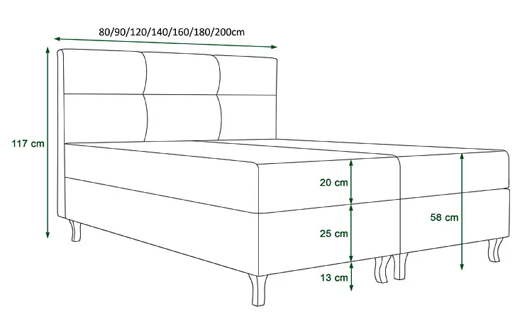 • Powierzchnia spania 80x200 cm, 90x200 cm, 140x200 cm, 160x200 cm, 180x200 cm, 200x200 cm.